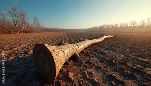 Felled tree trunk lies on dry barren ground. Bare trees form line on horizon under pale sky. Plowing marks scar empty field near felled wood.