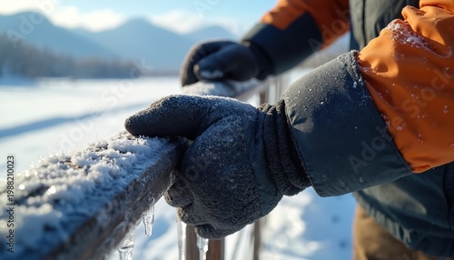Person wearing gloves holds icy railing outdoors. Snow covers wooden barrier and icicles hang below. Bright winter sun shines on snowy landscape with distant mountains.