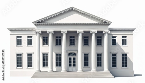 Neoclassical white building with columns, large windows. Grand structure represents government, law, education. Facade style evokes historical significance, authority, perfect for institutional