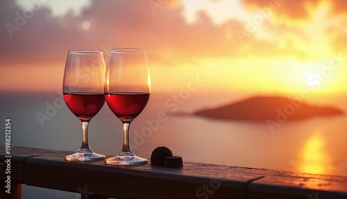 Two wine glasses sit on wooden railing with chocolates. Sunset over ocean island. Romantic evening relax atmosphere. Golden hour light reflects on water.