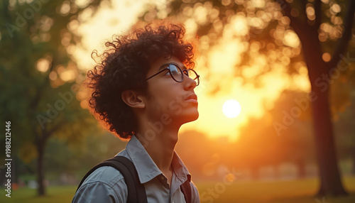Young man with curly hair and glasses looks up at warm sunset light in park. Person enjoys golden hour glow, feeling peace and inspiration. Boy reflects, dreams in nature.