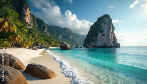 Tropical beach landscape with white sand shore palm trees and turquoise ocean water. Steep green jungle covered cliffs rise above calm sea bay.
