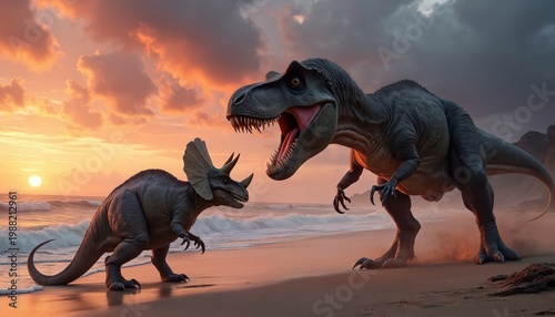 Two dinosaurs, Tyrannosaurus Rex, Triceratops, confront on sandy beach during dramatic sunset. Waves crash gently on shore as sky glows with orange, pink hues. Scene prehistoric confrontation.
