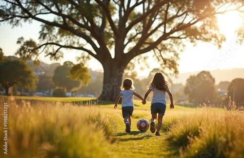 Two young siblings run together on a grassy field holding hands with a soccer ball near them. They are playing outside in a park with a large tree in the background at sunset. Back view.