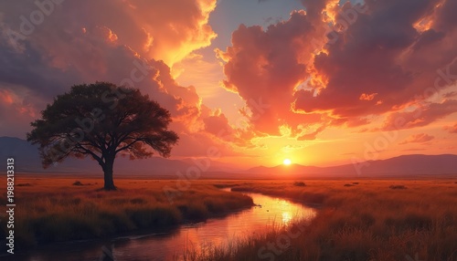 Sunset sky with vibrant clouds over savanna landscape. Lonely tree stands by winding river reflecting golden light. Warm orange glow on horizon, mountains afar, dry grass field.