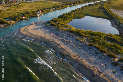 beautiful landscapes of the valleys near Ravenna ,Fiumi Uniti, where the river flows into the sea with the typical fishermen's huts at sunset