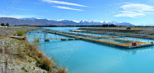 Panoramic view of Salmon Farm on Lake Ruataniwha, central Otago, NZ