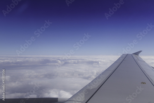Wing of airplane above the clouds in the sky, view from window.