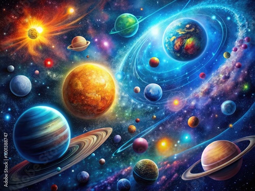 Abstract Space Drawing with Stars, Planets, and Cosmic Elements on a Dark Background