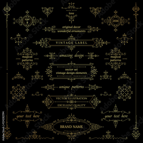 vector set of golden calligraphic vintage decorative elements for your design labels, invitations, banners, posters, badges, logos, postcards and more. Part two