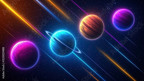A vibrant illustration of four planets with glowing rings and stars in a dark cosmic background.
