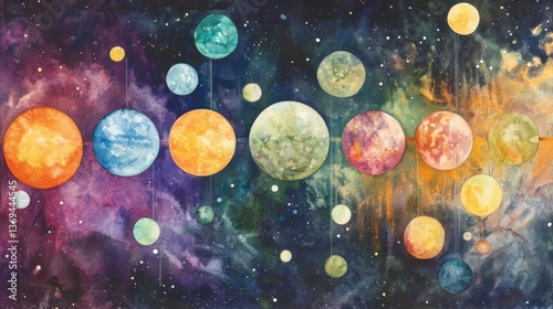 Watercolor astrology and tarot symbols Celestial Watercolor Painting of Planets and Nebulae in Space