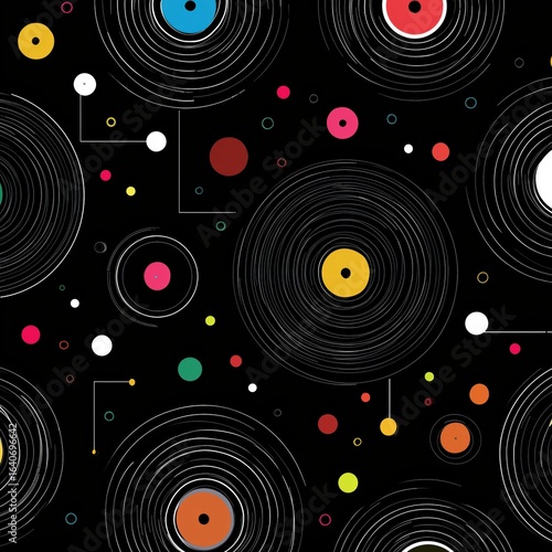 Modern artistic pattern of black vinyl records with white grooves, colorful dots (pink, green, yellow) and geometric lines on black backdrop blending music elements.