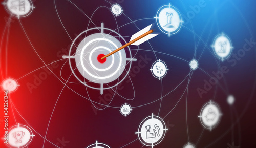 Achieving goals. Illustration with arrow hitting target on color gradient background with business related icons