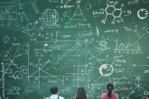 Children learning math and science concepts on board - Group of children in a classroom setting, facing a board filled with scientific diagrams and mathematical equations