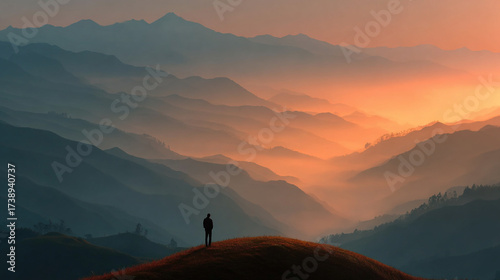 A silhouette stands overlooking misty mountains at sunset or sunrise.