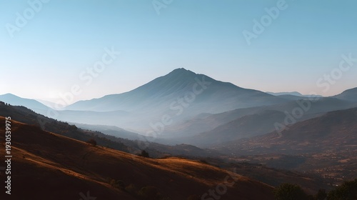 Serene mountain landscape at golden hour with hazy valleys and clear blue sky