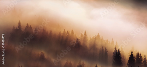 Incredibly beautiful sunrise in the mountains. Coniferous trees in the fog and the rays of the sun through the foggy forest.
