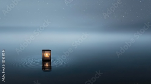 Photograph of a small lantern floating on the surface of a body of water. the lantern is lit, casting a warm glow on the water and creating ripples around it.