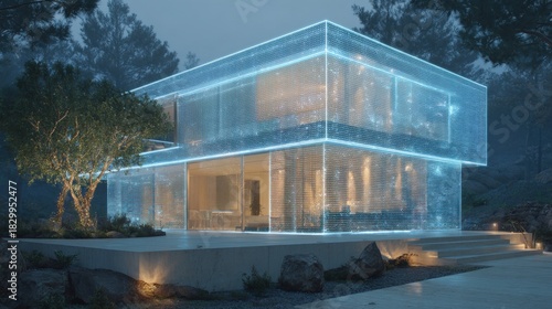 Modern house in the middle of a forest at night. the house is made up of a series of interconnected glass panels that create a grid-like pattern.
