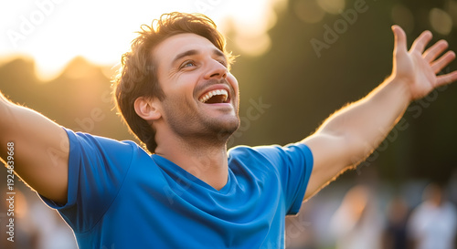 A joyful man in a blue shirt celebrating with open arms and a huge smile outdoors at sunset