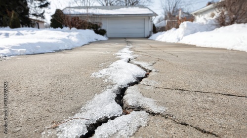 Melting Snow Reveals Cracks in Concrete Driveway of Suburban Home During Early Spring Season