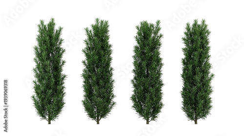 Podocarpus macrophyllus, yew plum pine, buddhist pine, evergreen shrub, columnar tree, garden plant, ornamental foliage, group of four vertical trees isolated on black background.