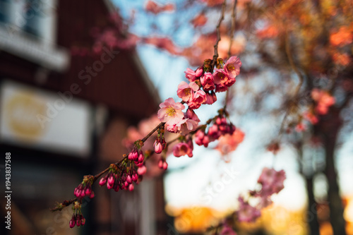 Cherry blossom branch in front of house at sunset in Heiligenhafen