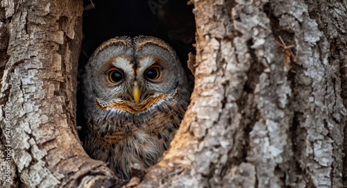Eastern screech owl with rufous and gray feathers peering cautiously from a hollowed tree trunk