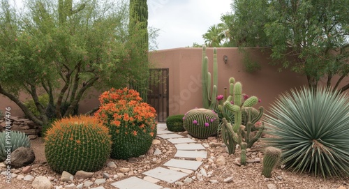 Desert flora and vibrant cacti creating a minimalist landscaped backyard scene