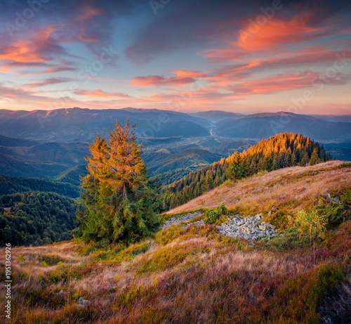 Majestic autumn sunset on Darvaika Peak. Wonderful evening scene of Carpathian mountains, Ukraine, Europe. Beauty of nature concept background.