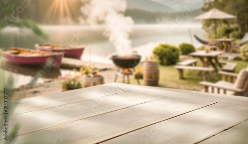 Empty wooden table outdoors with blurred garden background – summer vacation and relaxation product mockup. Natural landscape and peaceful and relaxing atmosphere. Vacation time.