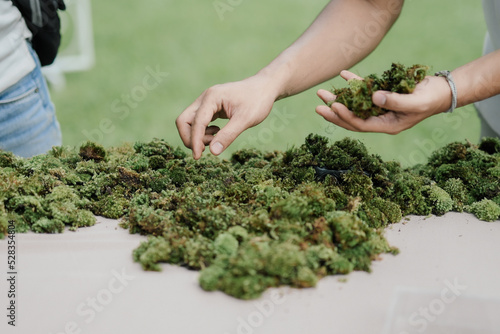 table setting with moss arrangement for fresh look and natural look on top of the wooden table with pink garment