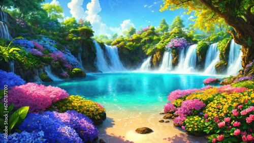 A beautiful paradise land full of flowers, rivers and waterfalls, a blooming and magical idyllic Eden garden.