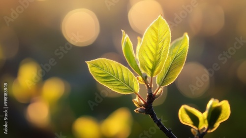 A Close-Up of a Branch with New Green Leaves Illuminated by the Warm Light of the Setting Sun