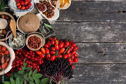 Medicinal plants and herbs composition: Dog rose, bunch branch Rosehips, types Rosa canina hips, essential oil. bunch, dried flowers of linden and chamomile elderberries and goji berries.