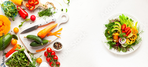 Fresh vegetables, fruits, microgreens and herbs for cooking healthy food at home. Clean eating, salad bowl. Top view.