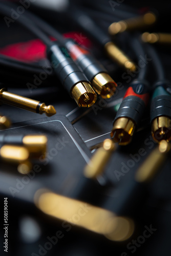 Professional audio cables for sound recording studio. Connector musical equipment with hi fi cable connectors. Curated collection of royalty free music images and photos for poster design template