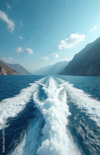 View from fast boat wake on clear blue sea, mountainous island coast. Sunny day travel over calm water, clear sky, white clouds, distance landscape.