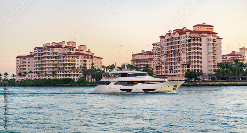 Luxury boat yachting. Motorboat sailing at sea. Luxury private yacht in sea. Motor yacht luxury vessel. Boat motor vacation on summer. Aerial view motorboat. Yacht boat at Fisher island, Miami