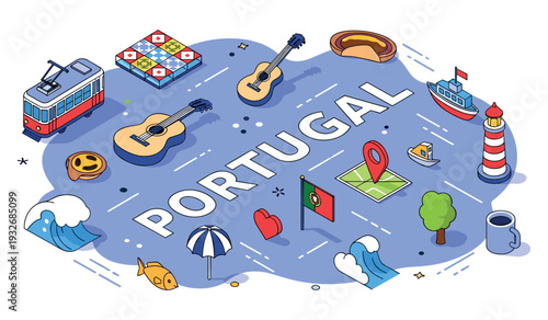 Portugal travel icons: tram, guitars, wave, lighthouse, flag, pastries, map, tree