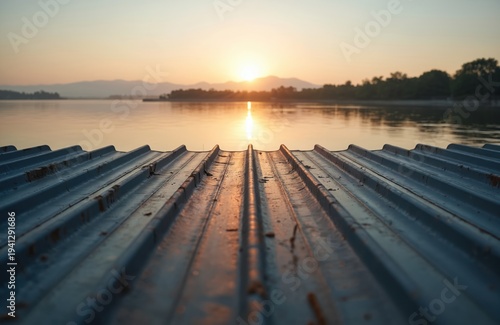 Corrugated metal roof overhangs calm lake at sunrise. Gentle waves reflect warm sun rays over distant tree line and hills. Serene natural beauty unfolds.