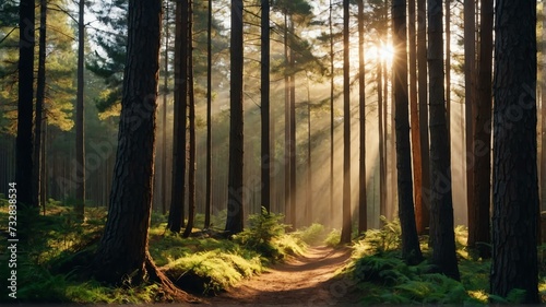 Pine trees forest path on on trail woods background at morning with sunlight rays from Generative AI