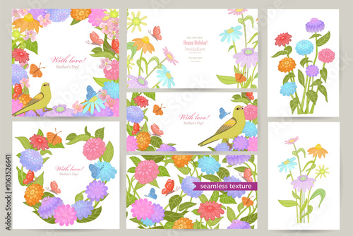 collection of vintage floral card with birds and butterflies. seamless texture with blooming twigs and insects. set of frames, wreath of stylized flowers. isolated bouquets of wildflowers