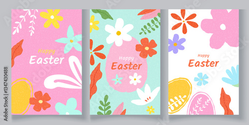 Set of Easter holiday cards with vibrant textures. Creative vector illustrations with hand drawn eggs, spring flowers, and grass. For party invitations, branding, ads, covers, and sales.