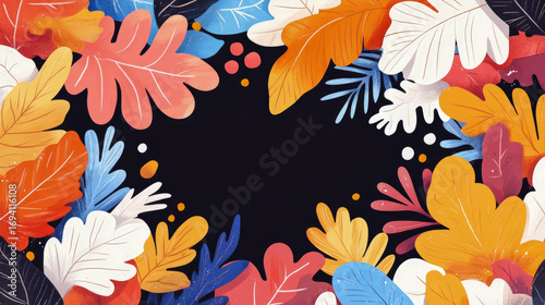 Vibrant autumnal and tropical leaves in stylized illustration form colorful decorative border around deep dark background
