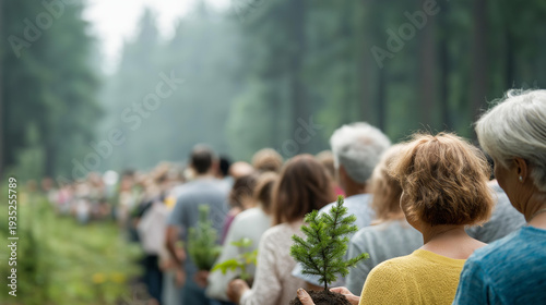Large diverse group of faceless volunteers of all ages gathered at a forest edge holding saplings, preparing to plant, defocused misty forest behind, World Environment Day, forest conservation,