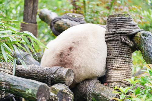 Cute Giant Panda, Ailuropoda melanoleuca or panda bear in forest at Chengdu Panda Breeding Research Center Dujiangyan. landmark and popular for tourists attractions in Chengdu, China.