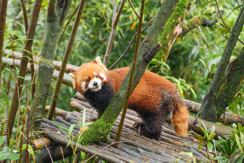 Cute Red Panda, Ailurus fulgens or lesser panda in forest at Chengdu Panda Breeding Research Center Dujiangyan. landmark and popular for tourists attractions in Chengdu, China. Travel and Vacation