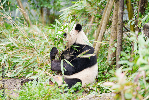 Cute Giant Panda, Ailuropoda melanoleuca or panda bear in forest at Chengdu Panda Breeding Research Center Dujiangyan. landmark and popular for tourists attractions in Chengdu, China.